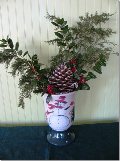 I shopped the house and yard to make this arrangement….used clippings from the cedar tree mentioned earlier in the post and clippings of holly leaves and berries. The pine cone came from a neighborhood park. I have about six pine cone trees in my yard and they don’t produce pine cones so I have to forage the neighborhood if I want a pine cone.